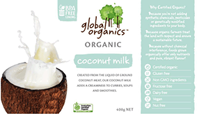 Global Organics Coconut Milk is certified organic, non GMO, vegan and gluten, fructose, dairy and nut free.